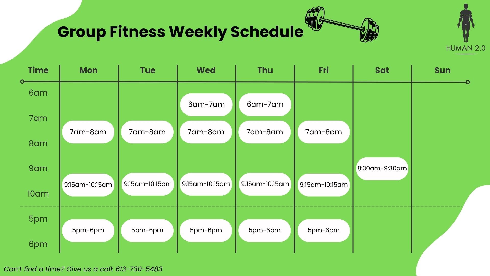 - Wednesday (Mobility 2.0): 6 am, 7 am, 9:15 am, 5 pm